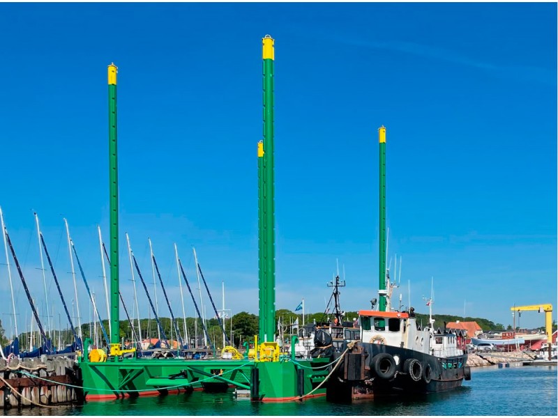The is built as a pontoon jack-up, which means that it glides easily and effortlessly through the water, despite its total weight of 70 tons. Furthermore, the vessel is self-maneuvering and equipped with 3 bow thrusters, which enable the platform to enter shallow water down to a depth of 1.5 meters.